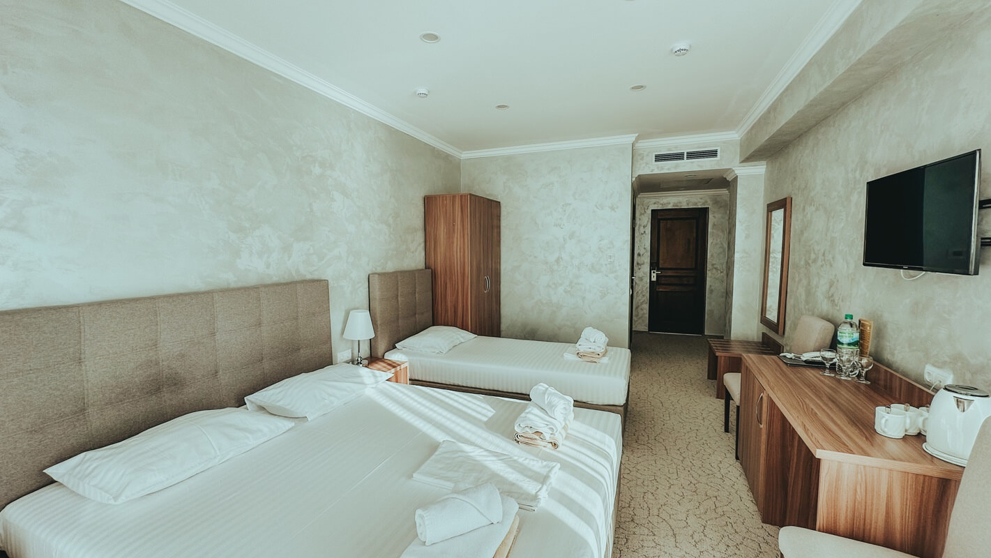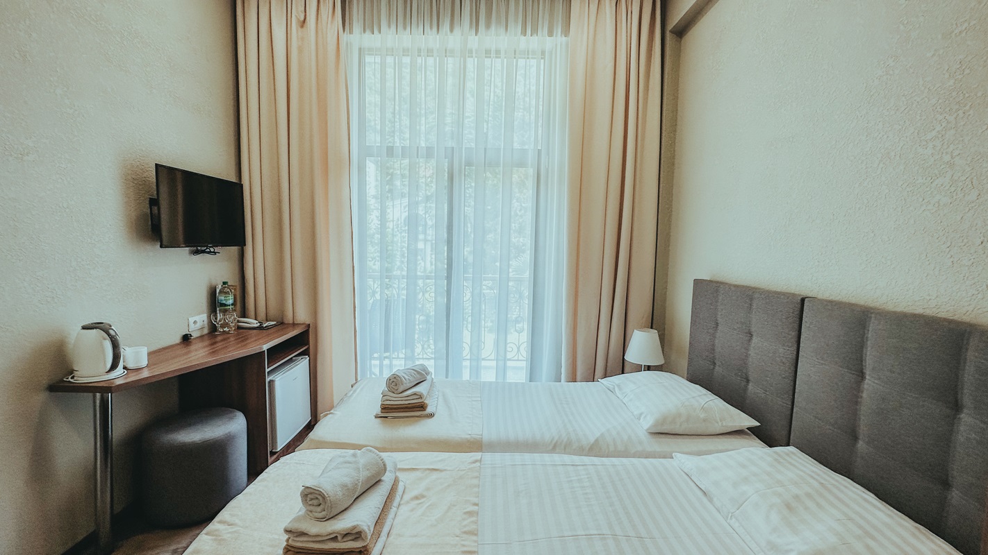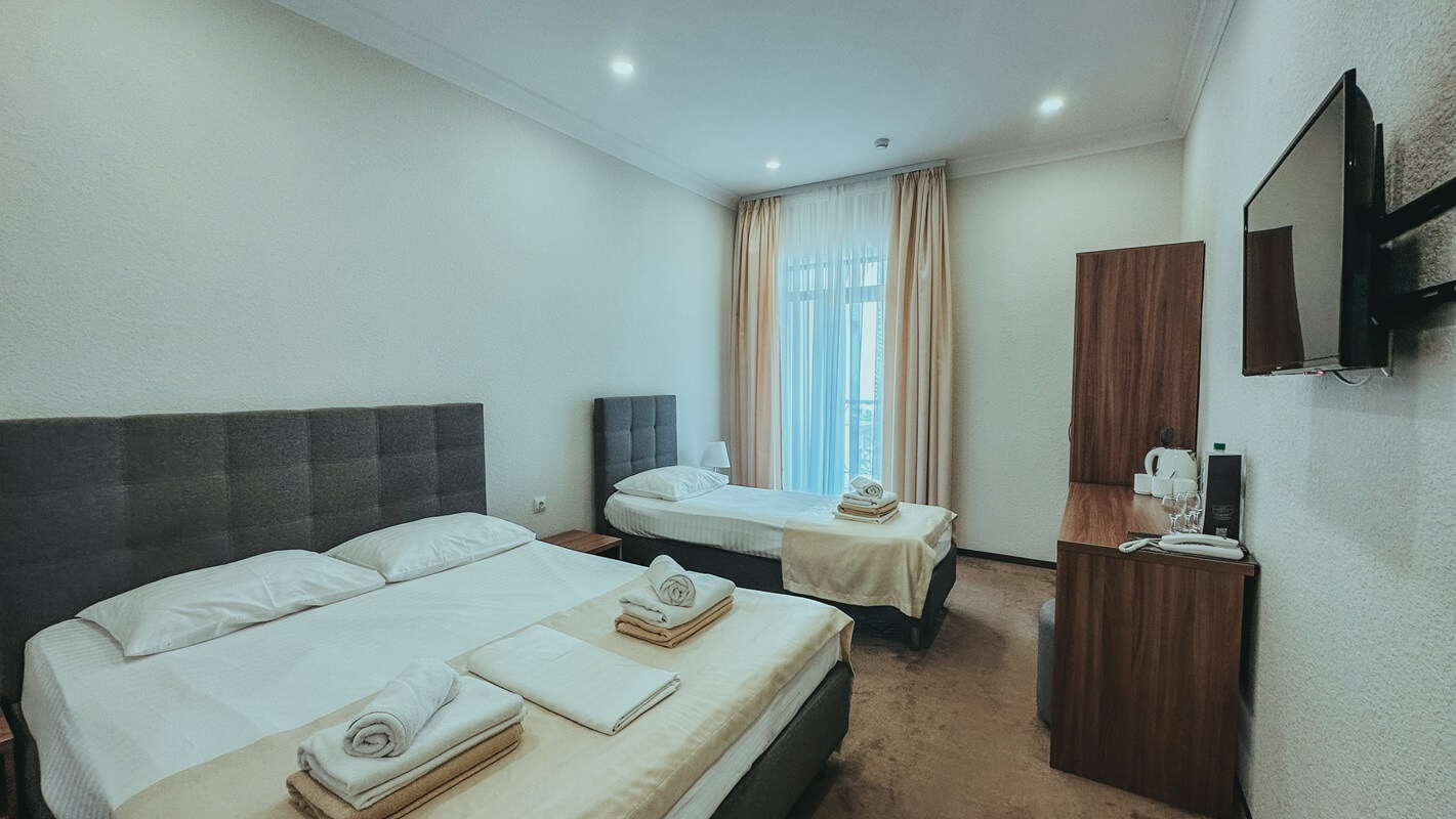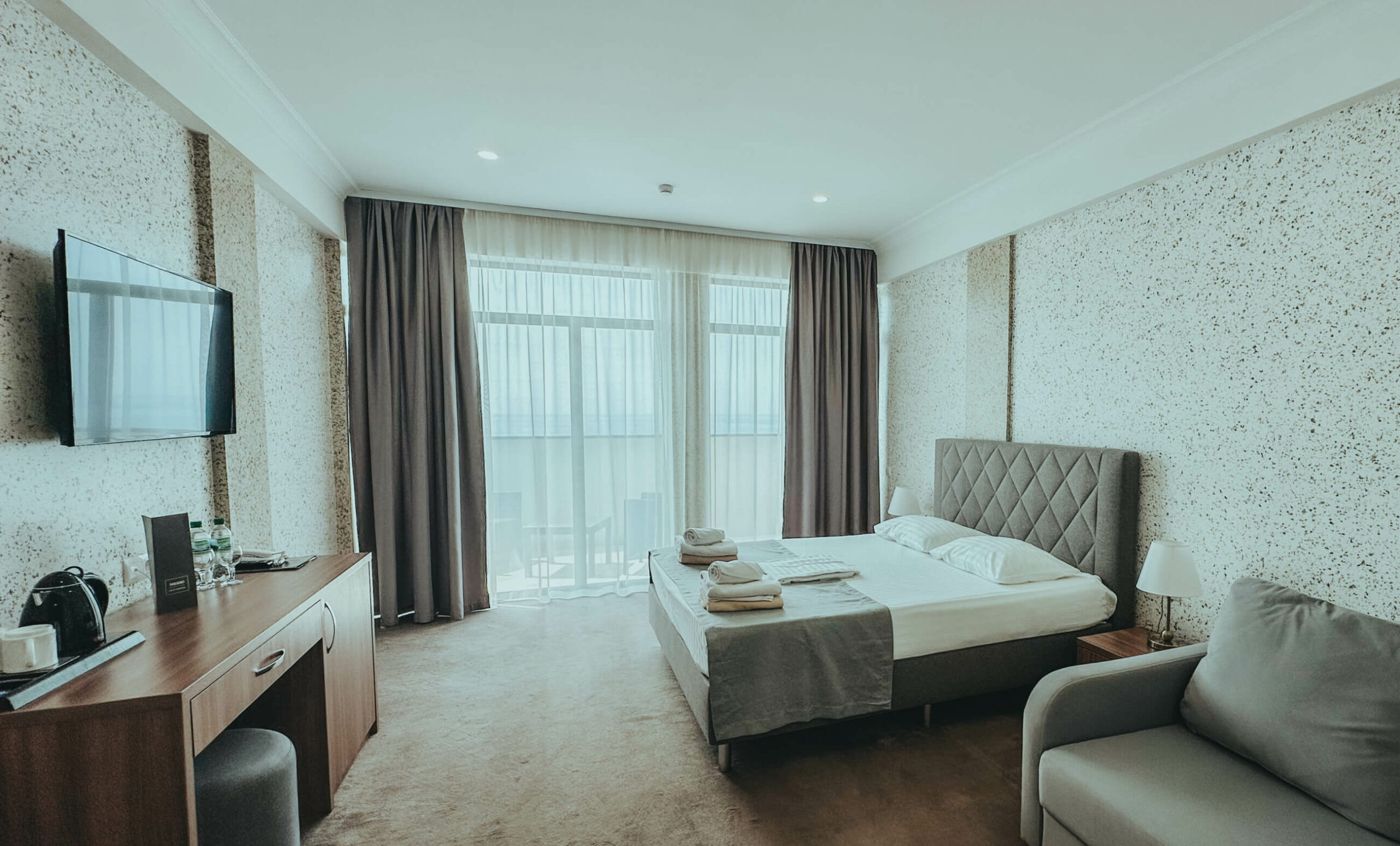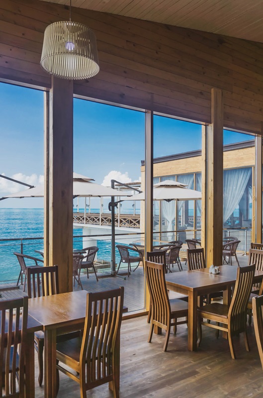 Отель расположен на первой береговой линии — 10 метров до моря.
