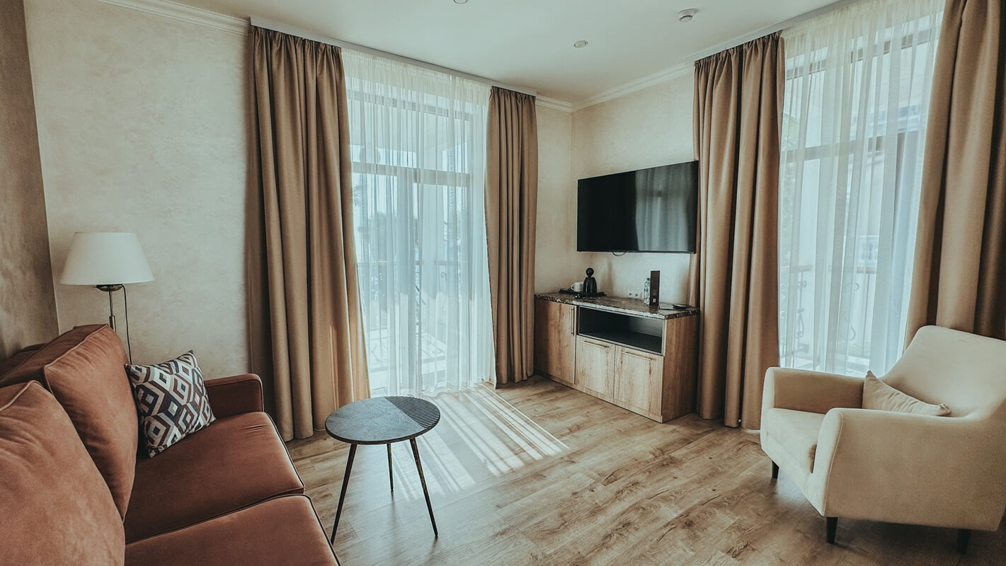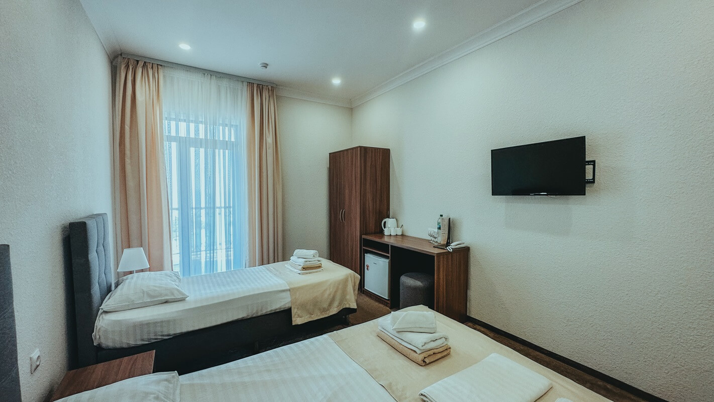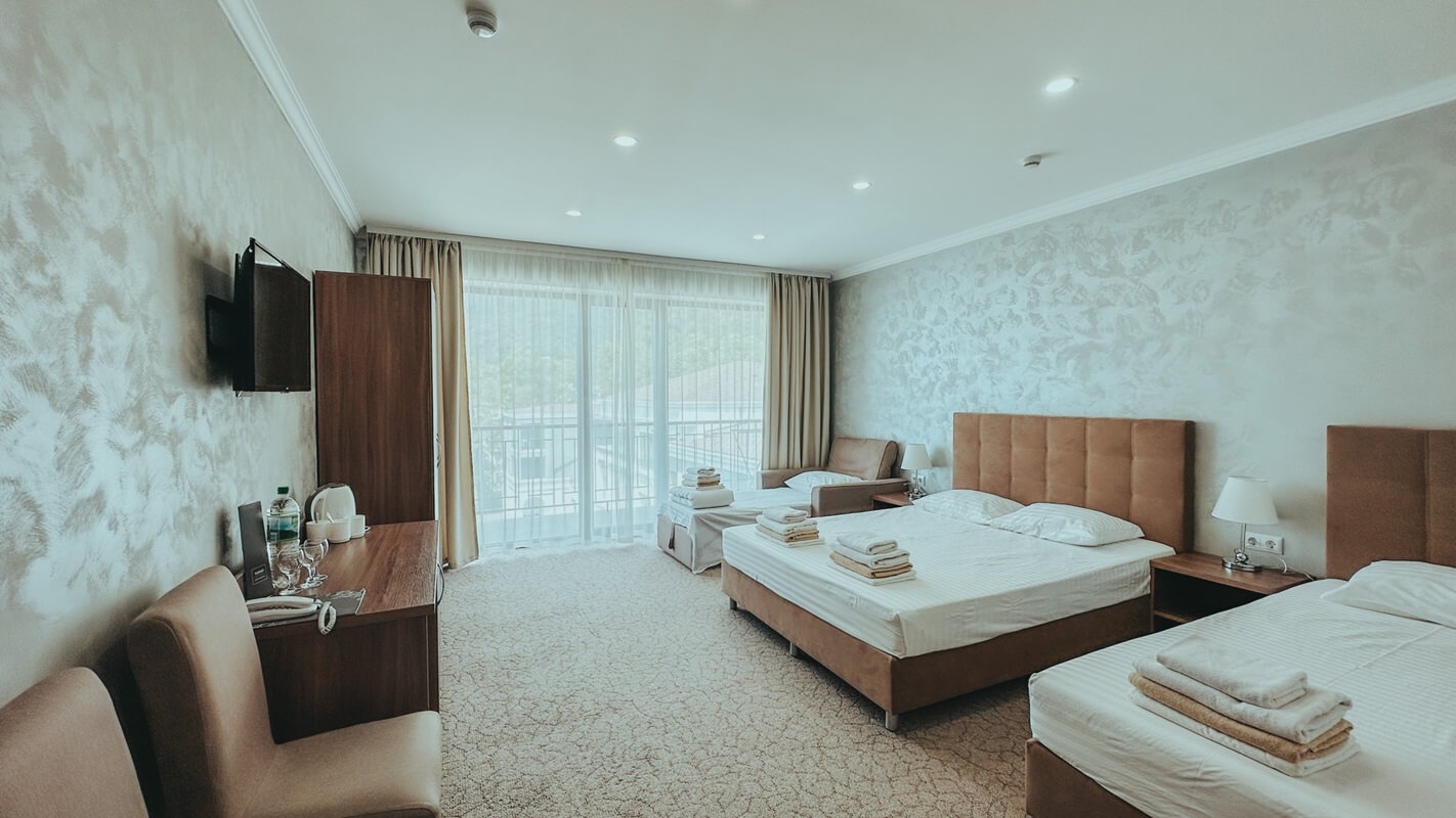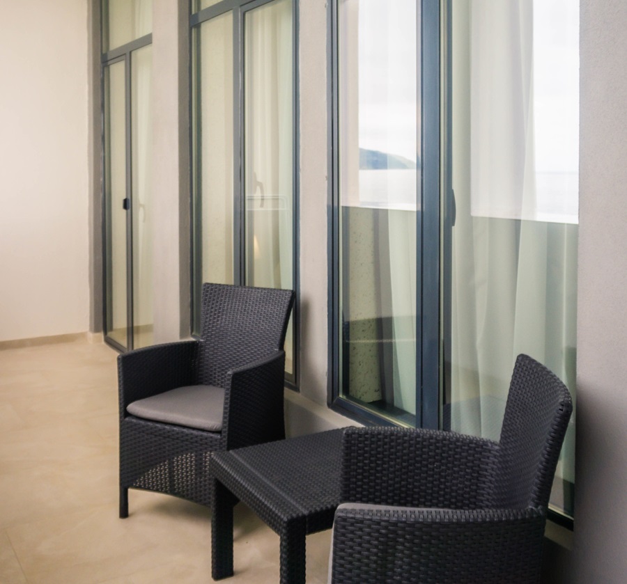 Отель расположен на первой береговой линии — 10 метров до моря.