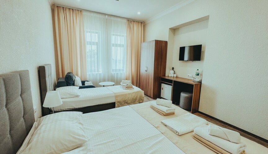 Комфортабельный трехместный однокомнатный номер со всеми удобствами, оборудован одной двуспальной кроватью и одной односпальной . Доп. место — предусмотрено раскладное кресло, стоимость доп. места — 2 500 ₽. Без балкона.