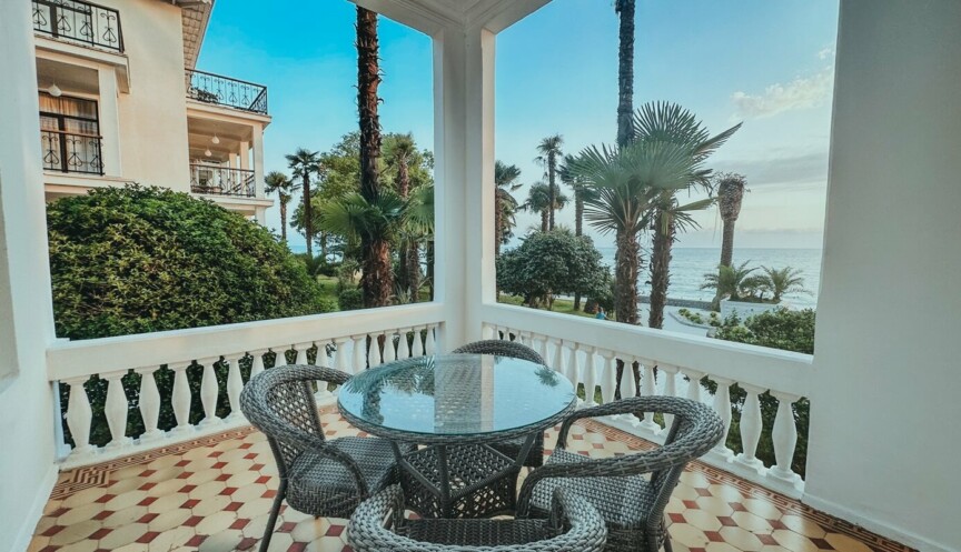 Отель расположен на первой береговой линии — 10 метров до моря.