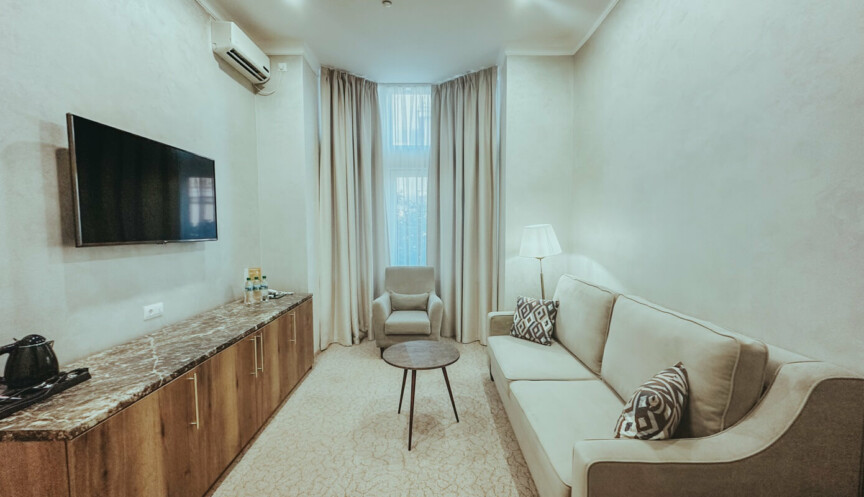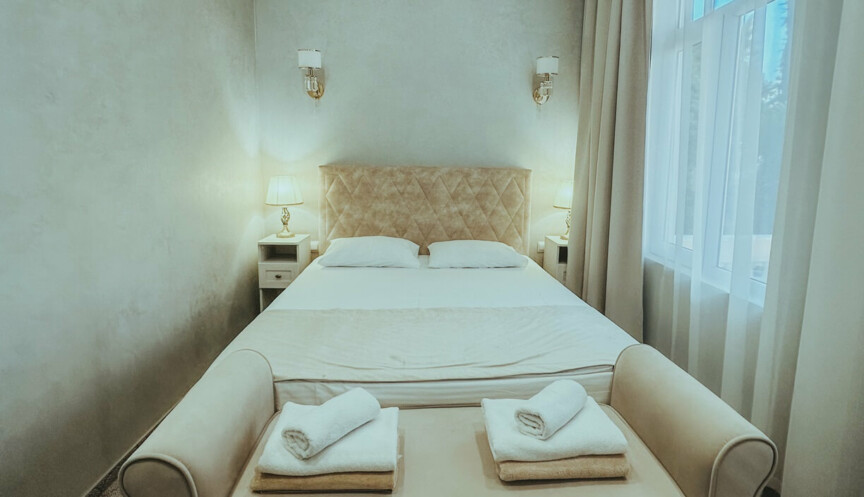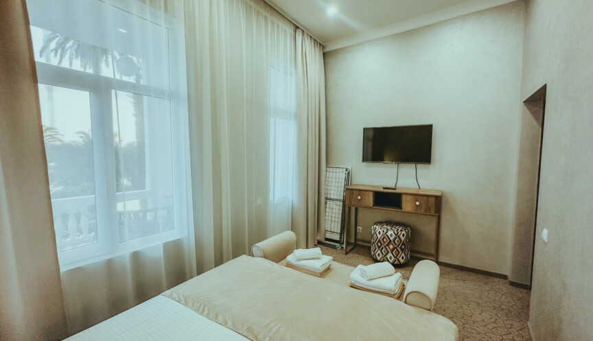 Комфортабельный четырехместный трехкомнатный номер со всеми удобствами, оборудован одной двуспальной и двумя односпальными кроватями.
