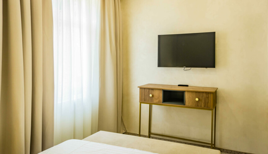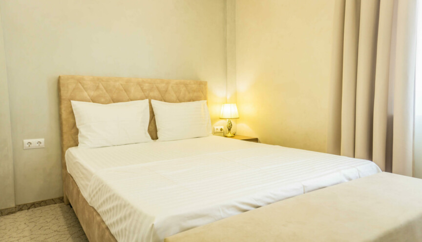Комфортабельный двухместный двухкомнатный номер со всеми удобствами, оборудован двуспальной кроватью.