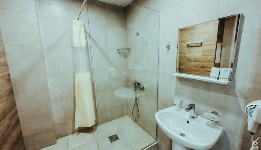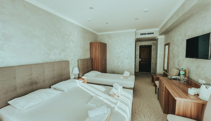 Комфортабельный трехместный однокомнатный номер со всеми удобствами, оборудован одной двуспальной и одной односпальной кроватью.